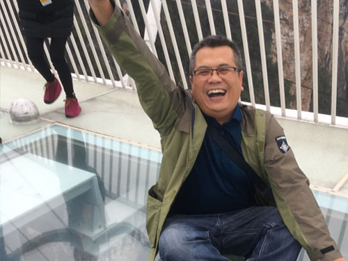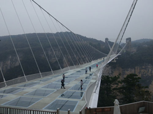 走出黃龍洞,我們來到了張大界大峽谷玻璃橋名“云天渡”,主跨430米,一跨過峽谷,橋面長375米,寬6米,橋面距谷底相對高度約300米。這座全透明玻璃橋長度、高度位居世界第一。我們慢慢的往下走,玻璃橋中間是透明的玻璃連接著的,剛踏上去的時候,看著下面的風(fēng)景,是有一點(diǎn)害怕的,特別是對于本來就有點(diǎn)恐高的來說。不過經(jīng)過一會兒的內(nèi)心暗示個調(diào)節(jié)之后,就能慢慢的接受了,然后繼續(xù)向前走去。橋上人很多,橋中段人更多,很多人都在拍照,有時候還能感覺到橋在輕微的晃動,有些稍微膽大的人直接擺好姿勢開啟狂拍模式,我們也加入了狂拍大隊中。剛開始有一點(diǎn)恐高,一會兒適應(yīng)了就好了,于是就拍拍拍,走到橋的盡頭之后,離開玻璃橋,進(jìn)入下一行程。
